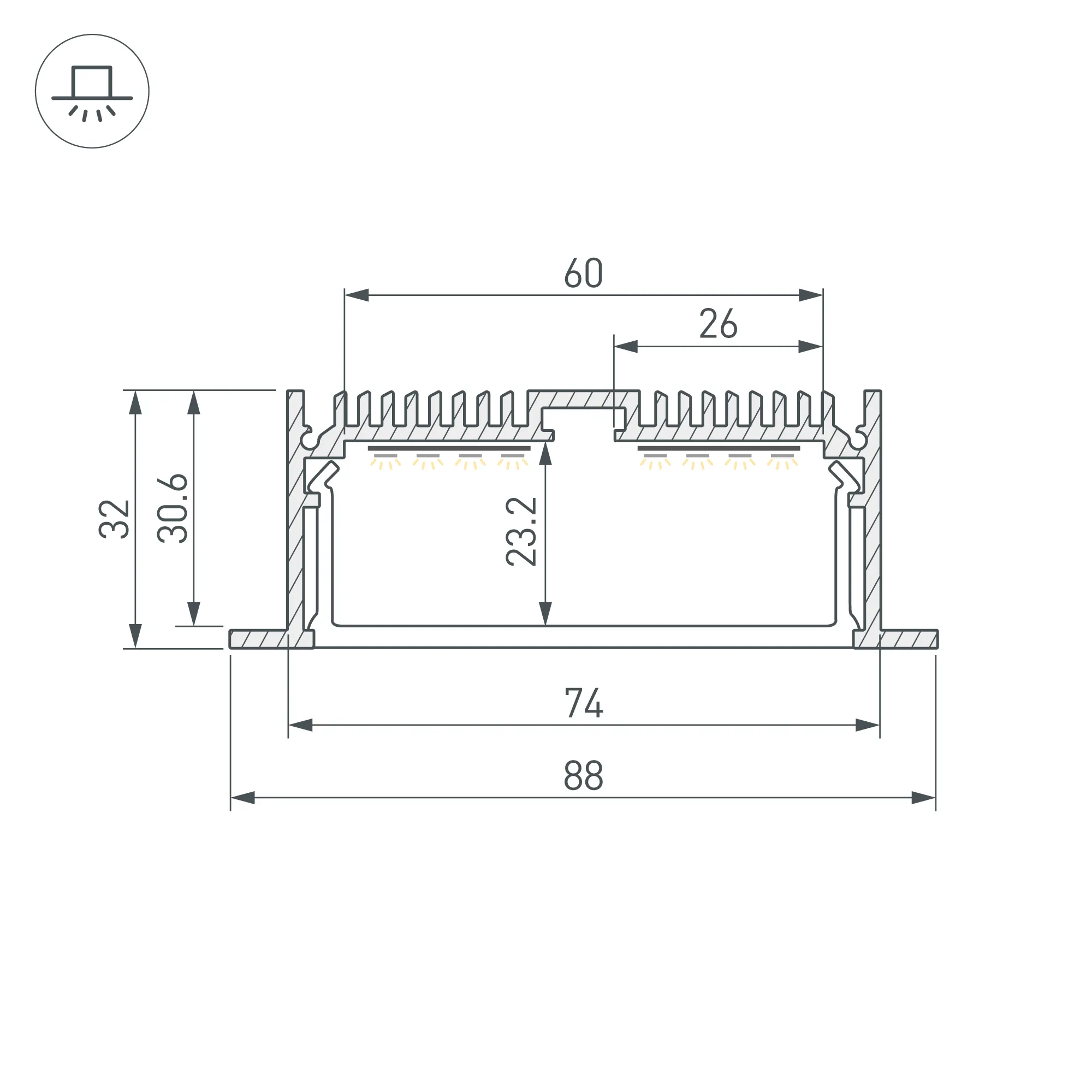 Алюминиевый анодированный профиль для светодиодных лент и линеек. Габаритные размеры (L×W×H): 2000x88x32 мм, паз для установки 74 мм. Ширина площадки для ленты 60 мм. Экраны, заглушки и другие аксессуары приобретаются отдельно. Цена за 1 метр.