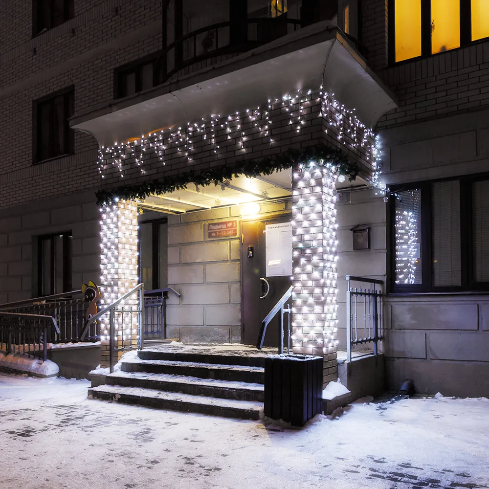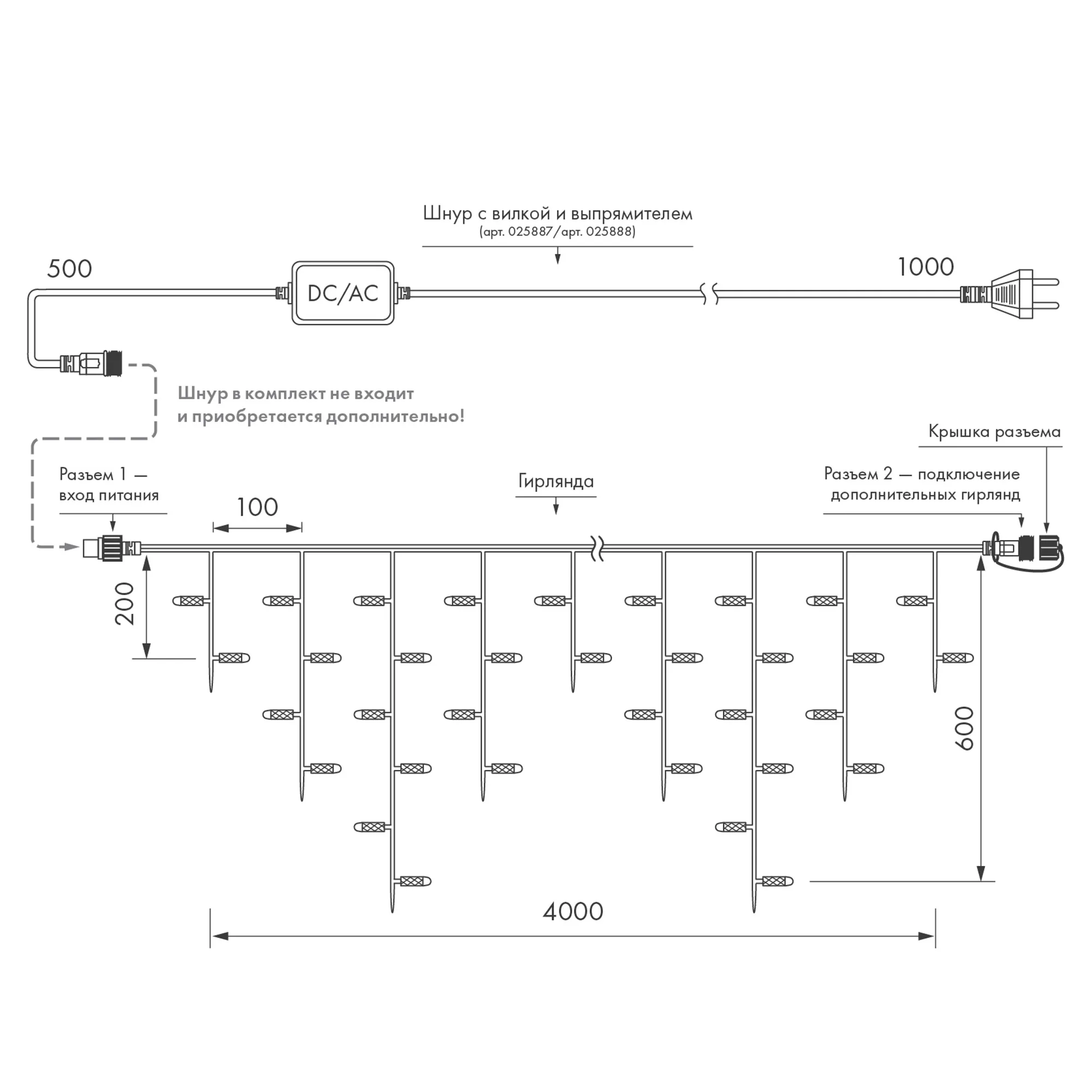 Светодиодная бахрома Pro. Размер 4000x600 мм (длина 4000 мм, по длине 32 нити высотой 200/600 мм). Количество светодиодов 128 шт размером 7 мм. Цвет свечения БЕЛЫЙ (6000 К), эффект постоянного свечения с мягким световым рисунком (выпуклая молочно-белая линза). Провод черный, каучук. Питание 230 В, Мощность 8 Вт, защита IP65, применение на улице под навесом. Аксессуары для подключения приобретаются отдельно.