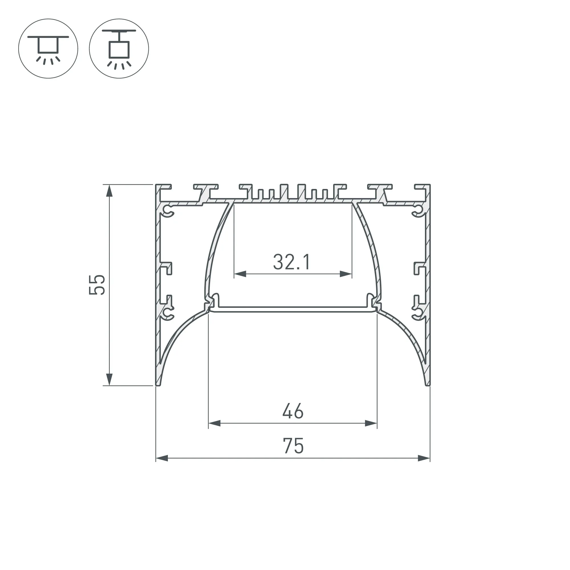 Под заказ от 100 м, сроки и цену уточняйте у менеджера. Алюминиевый анодированный накладной/подвесной профиль для светодиодных лент и линеек. Габаритные размеры (L×W×H): 2000x75x55 мм. Ширина площадки для ленты 32.1 мм. Экраны, заглушки и другие аксессуары приобретаются отдельно. Цена за 1 метр.