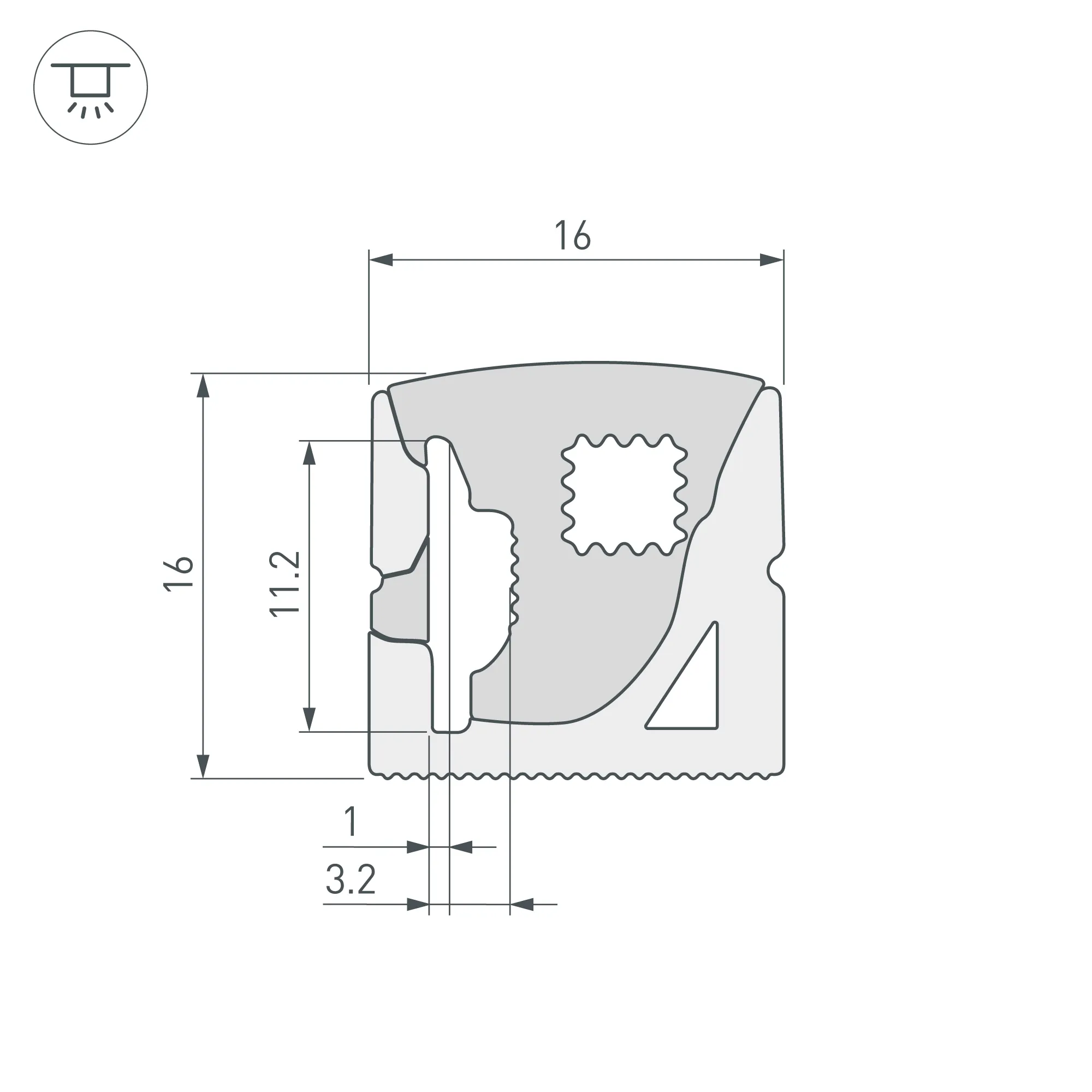Цельнолитой силиконовый гибкий профиль, белый матовый. Габаритные размеры 5000×16×16 мм Гнется в плоскости. Для установки во влажных помещениях необходима герметизация при помощи двухкомпонентного эпоксидного герметика. Класс пылевлагозащиты – IP65 (при соблюдении технологии герметизации). Для лент шириной от 8 до11 мм, высотой до 3,3 мм и мощностью до 10 Вт/м. Угол излучения 110°. Поставляется в катушках по 5 м. Цена за 1 м.