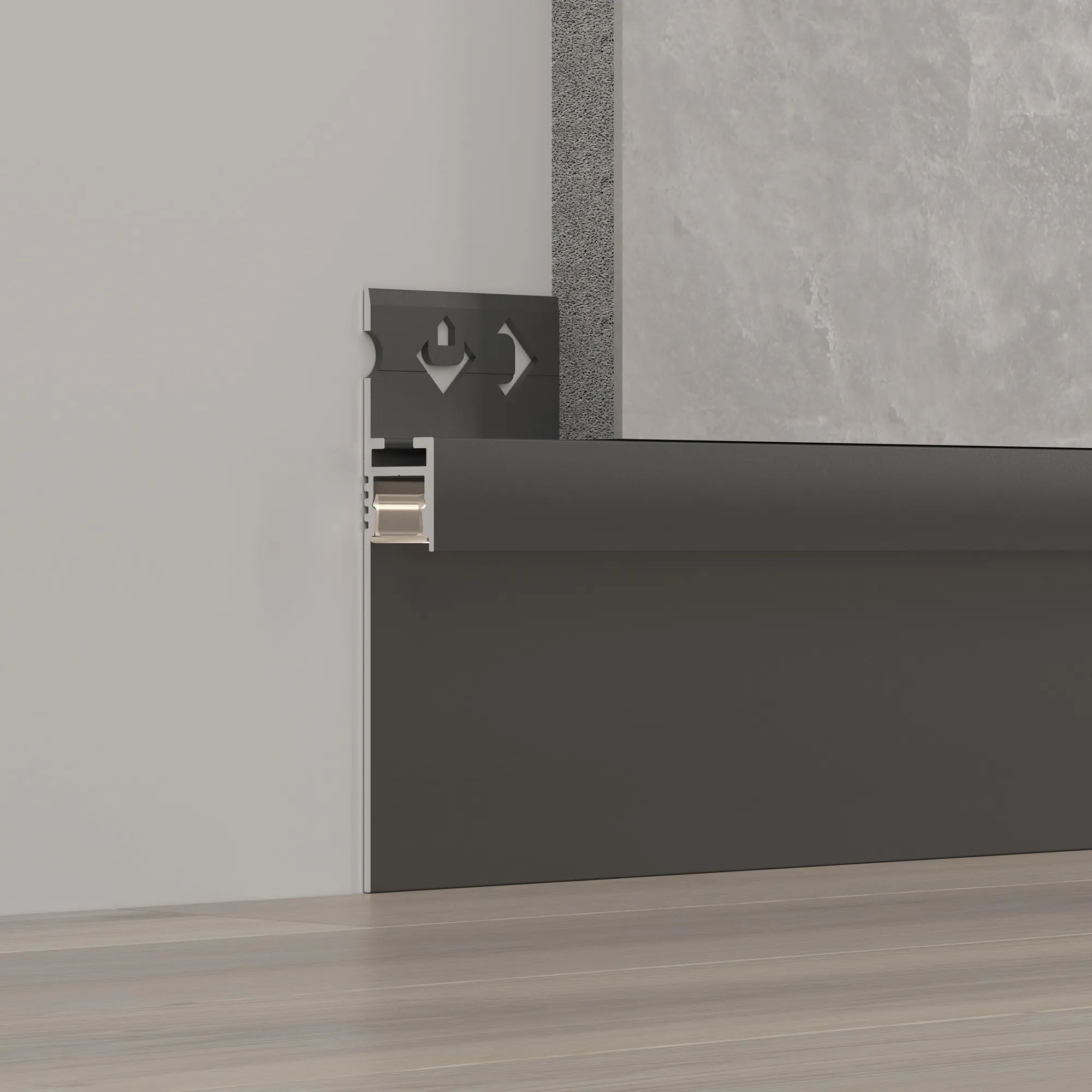 Алюминиевый профиль для светодиодных лент и линеек, для подсветки стен и пола по периметру. Цвет - черный RAL9005 (порошковая окраска). Габаритные размеры (L×W×H): 3000x13,2x85 мм. Ширина площадки для ленты 9,2 мм. Аксессуары приобретаются отдельно. Цена за метр.